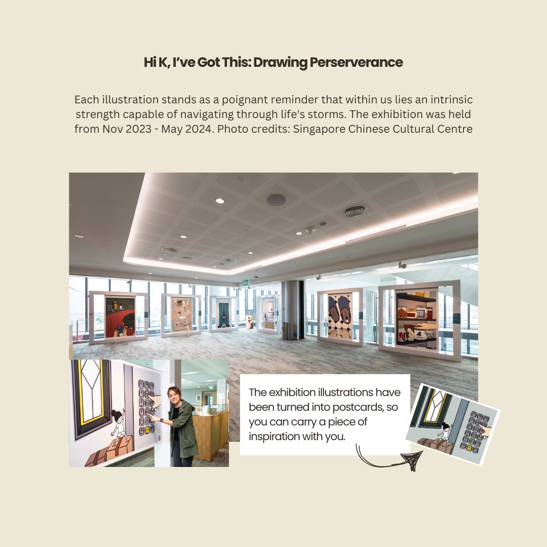 Bring home the essence of Drawing Perseverance – Hi K, I’ve Got This, Paige’s inaugural solo exhibition supported by the Singapore Chinese Cultural Centre. This exclusive set of 14 postcards features illustrations from the exhibition, each capturing the strength, resilience, and bravery embodied by K, the 'bungirl' who reminds us that it's okay to struggle and seek support.