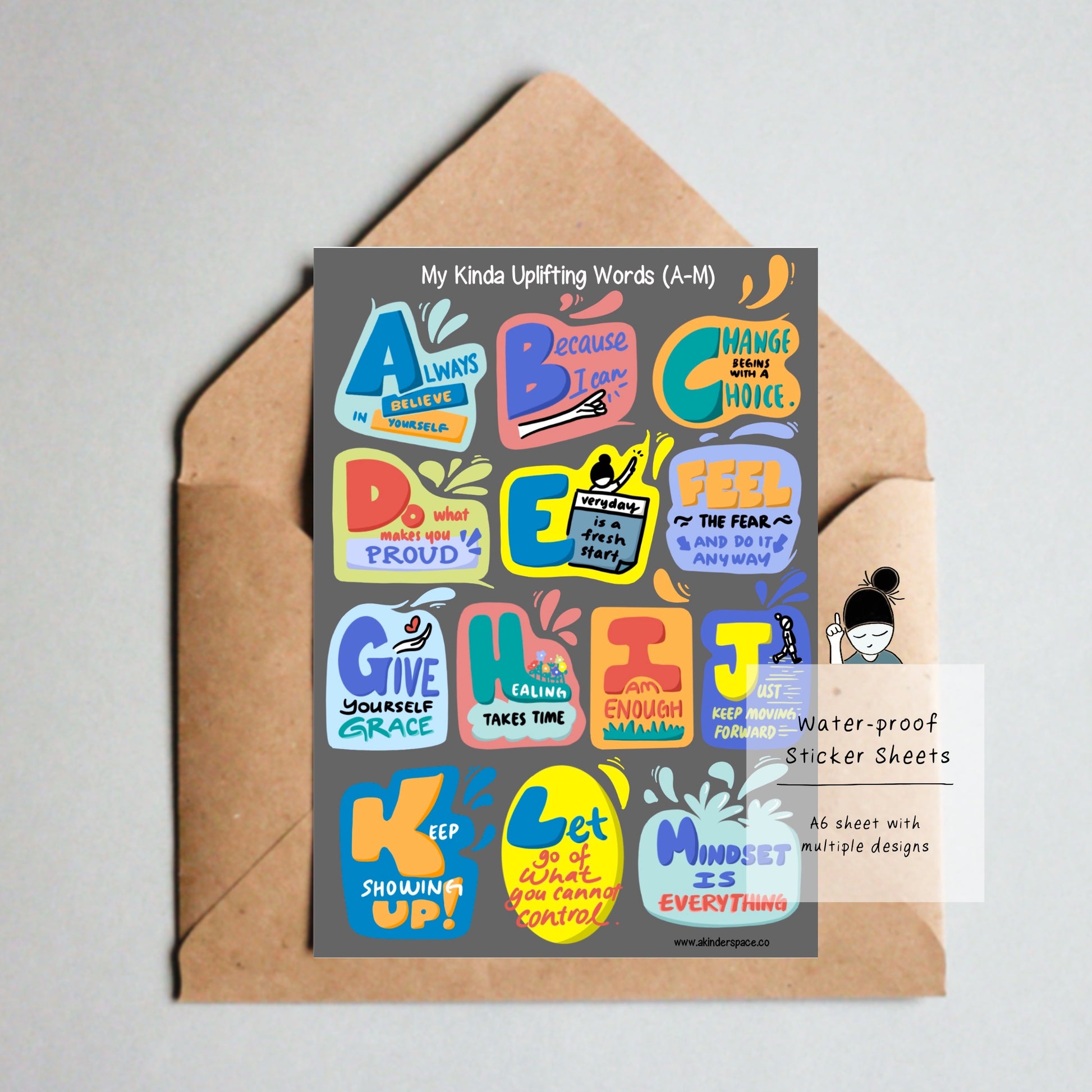 - Original hand-drawn illustrations with relatable quotes/words